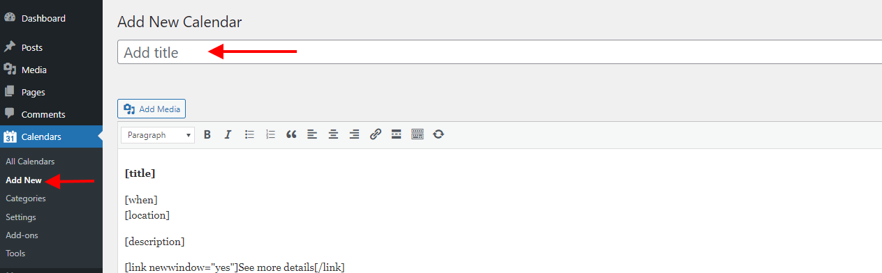 - Navigate to the Calendars > Add New section within your WordPress dashboard and add your calendar title as illustrated below:
