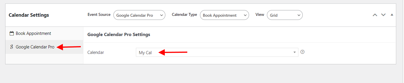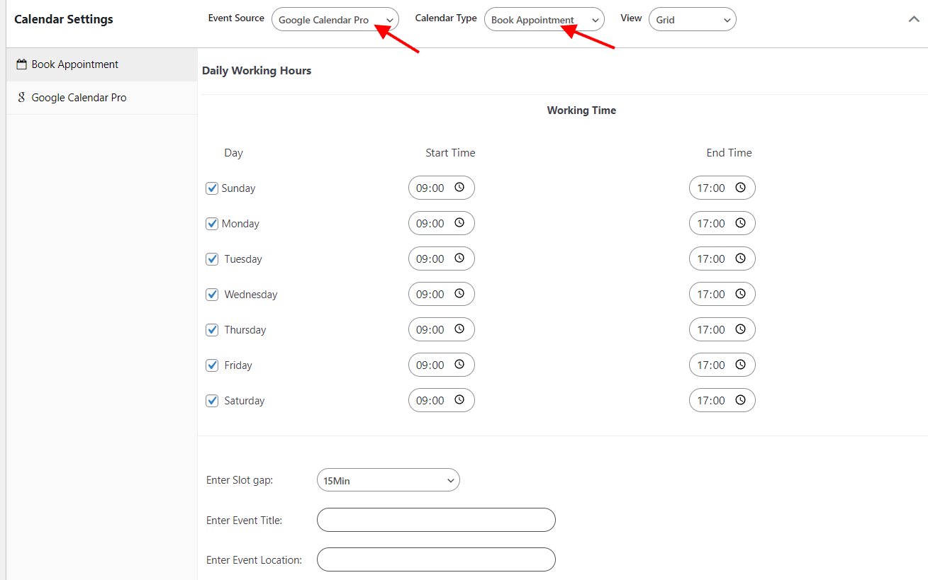 - Within the calendar settings on the calendar, set the Event source to “Google Calendar Pro”, and the Calendar Type to “Book Appointment”. It is also important to note that there is only a “Grid” view display. Below is a screenshot on this: