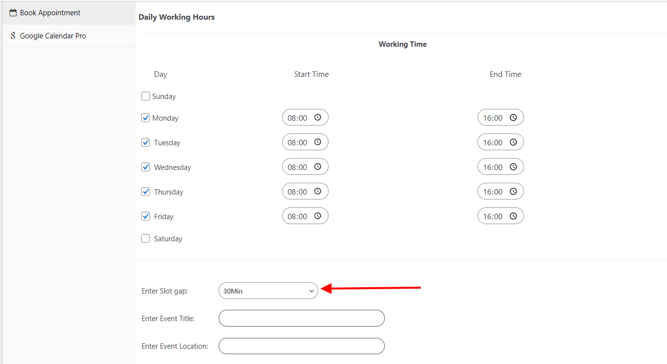 - Within the slot gap field, set the amount of time that you would like your appointments to take.