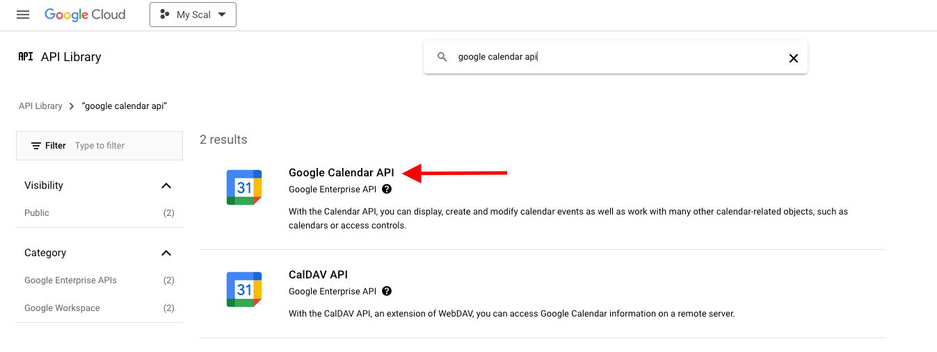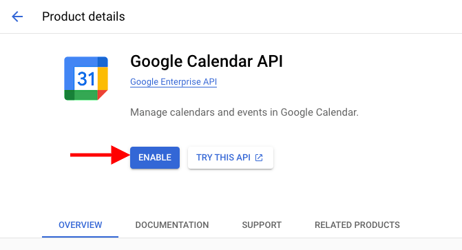 4. Under the API Library, search for and select Google Calendar API. Then click “Click Enable”.