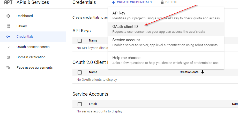 5. Select Credentials from the left-hand menu, click +CREATE CREDENTIALS, then skip the setup wizard by selecting client ID.