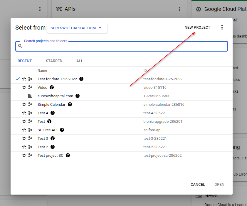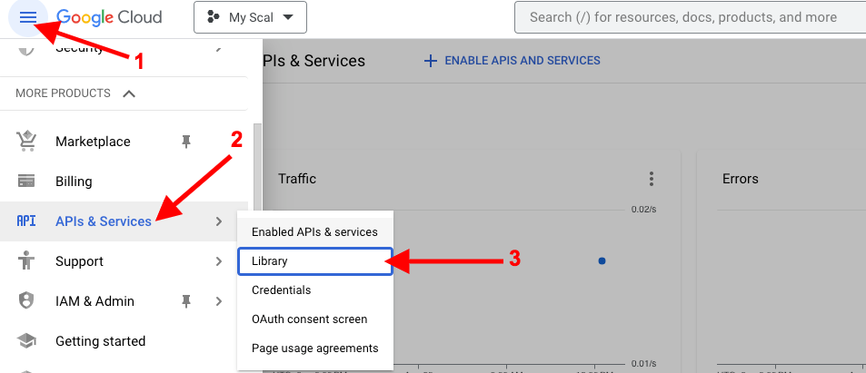3. From the Google Developers Console Dashboard select Enable APIs and Services. If you don’t see this, select Library from the menu on the left side of the screen. If you already have a project created in the Google console using the original method, you can skip to step 5.