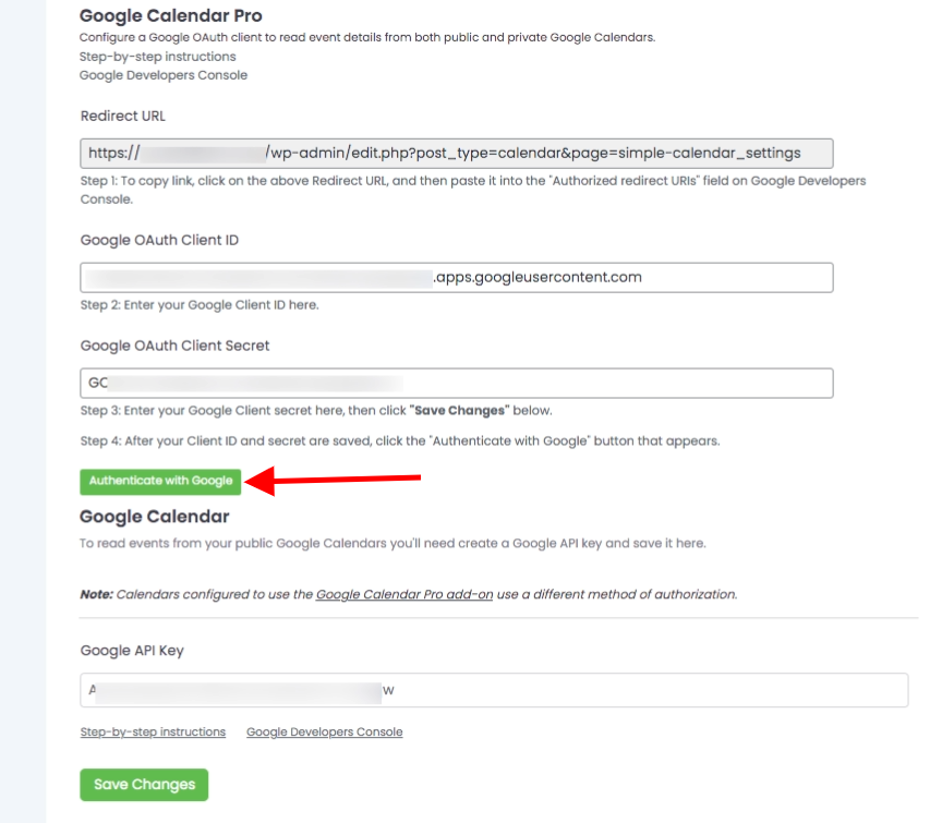 13. One at a time copy and paste the Google API Key, Client ID and the Client secret values from the Google Developers Console and paste them in the two fields here. Then click Save Changes.
