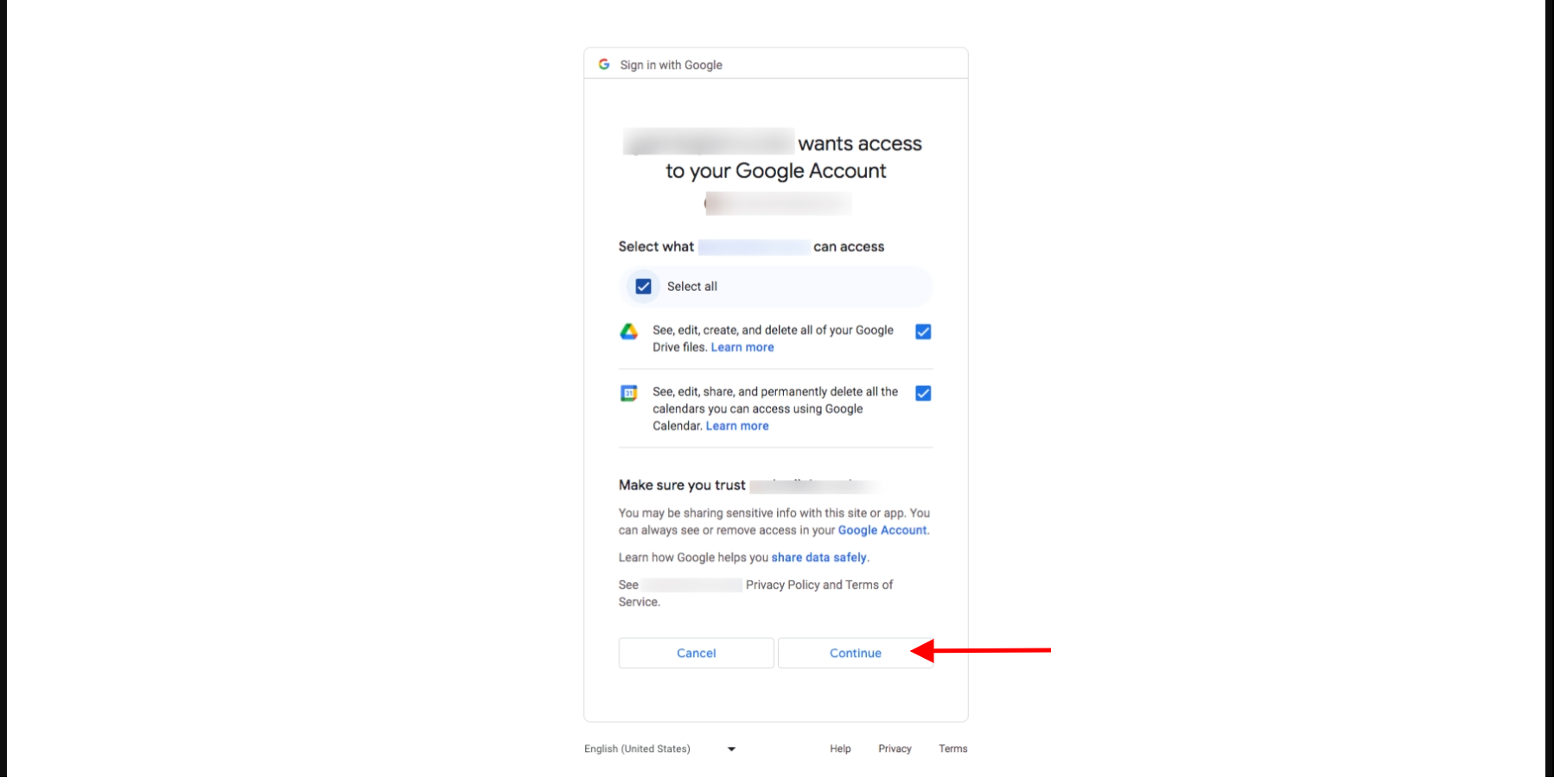NB: If you need to verify your app, please check out the article here on how to go about this. Else you can proceed with the authentication and check all selections as illustrated below and click on the continue button: