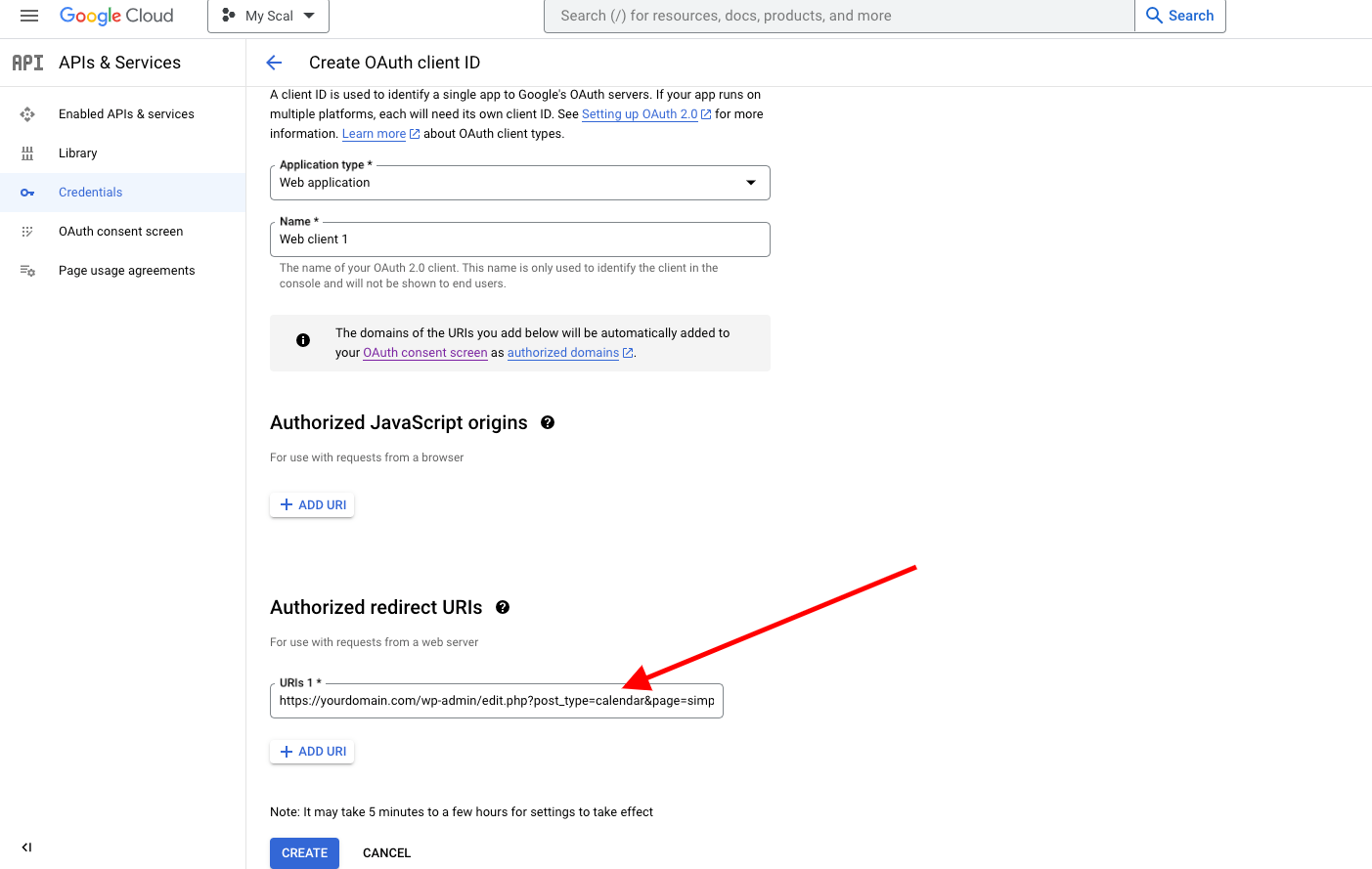 7. Enter a name for the application (such as “Simple Calendar Client ID”) then fill in your Authorized redirect URI. This is the URL within your Redirect URL field under the Calendar > Settings on your WordPress dashboard. Once this is done, click on the Create button. Note: It may take 5 minutes to a few hours for settings to take effect.