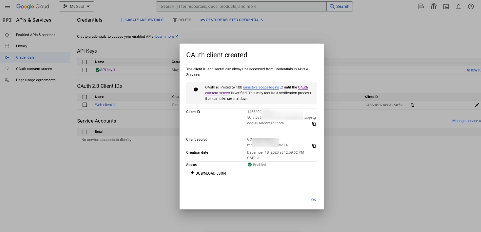 8. Your Client ID and Client Secret should now be created. You can Copy and paste those later on.