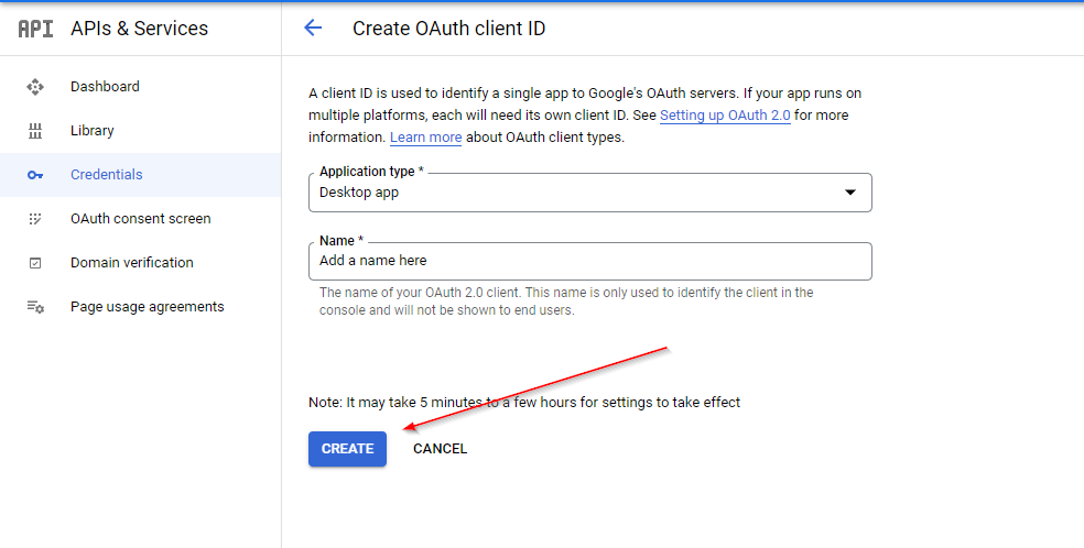 v) Enter a name for the application (such as “Simple Calendar Client ID”) then click Create. Note: It may take 5 minutes to a few hours for settings to take effect.
