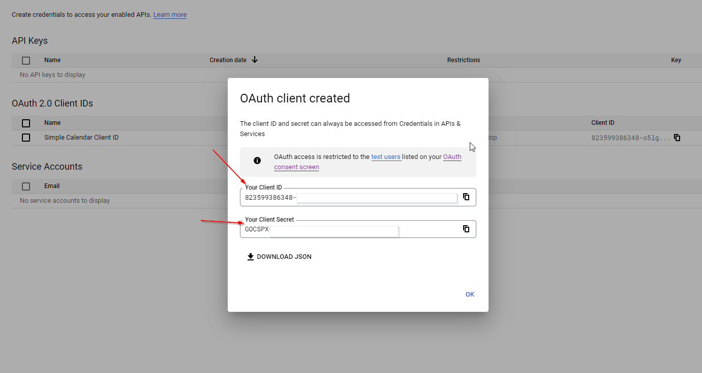viii) One at a time copy and paste the Client ID and the Client secret values from the Google Developers Console and paste them in the respective fields within the calendar settings. Then click Save Changes.